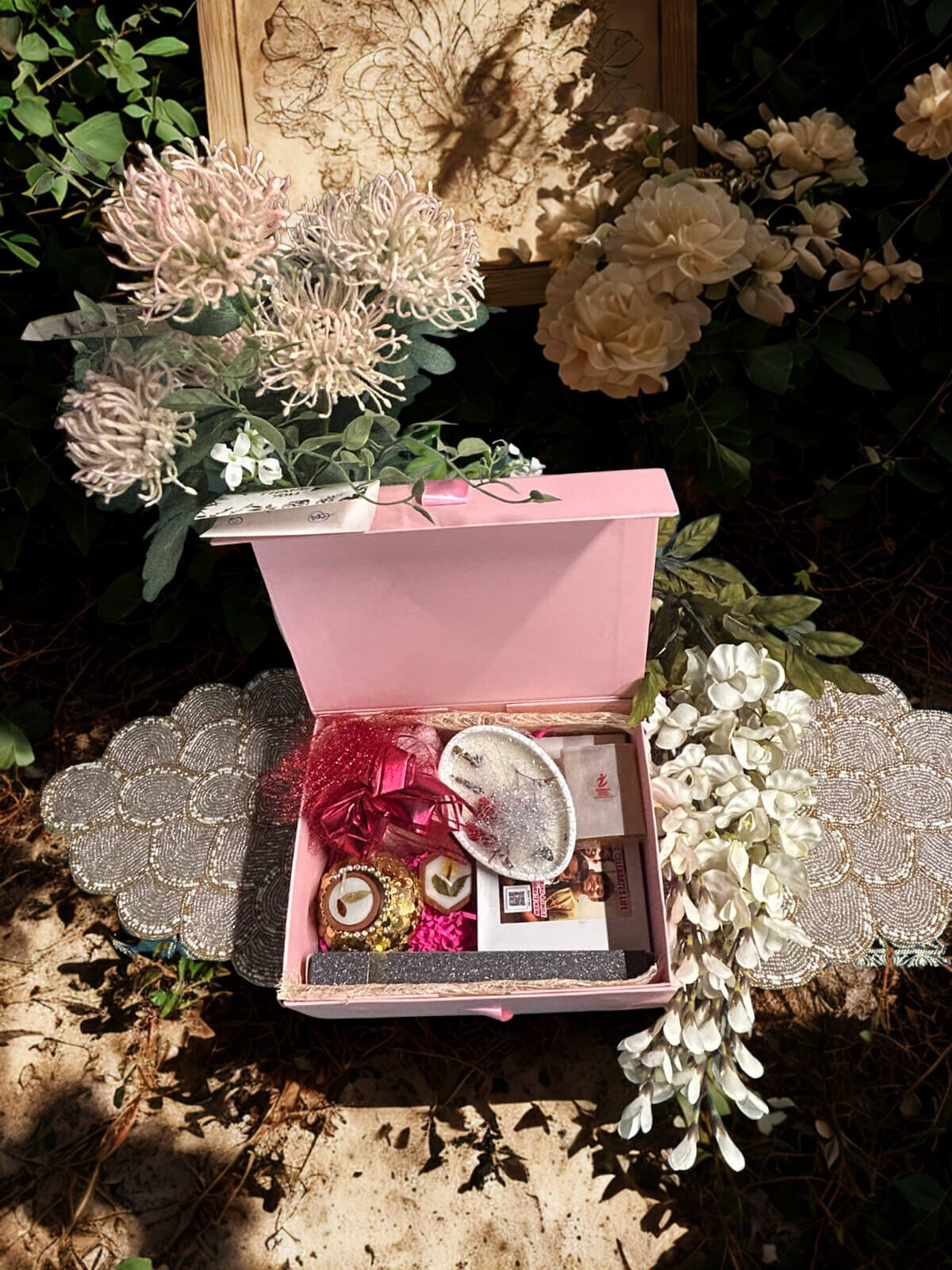 This thoughtfully arranged hamper includes a blend of decor, treats, and personalised elements, featuring: